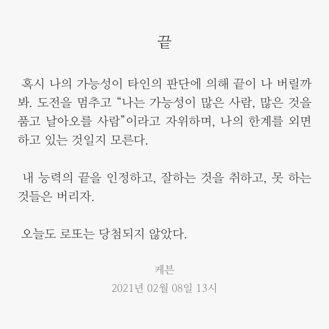 끝 2021. 2. 8. 13:21 케븐 씀 반응형 반응형 공유하기 게시글 관리 DRUNKEN KEVIN '씀' 카테고리의 다른 글 결국 (0) 2021.05.10 날씨 (0) 2021.05.07 거울 (0) 2021.02.05 안다는 것 (0) 2020.09.03 대화 (2) 2020.06.05