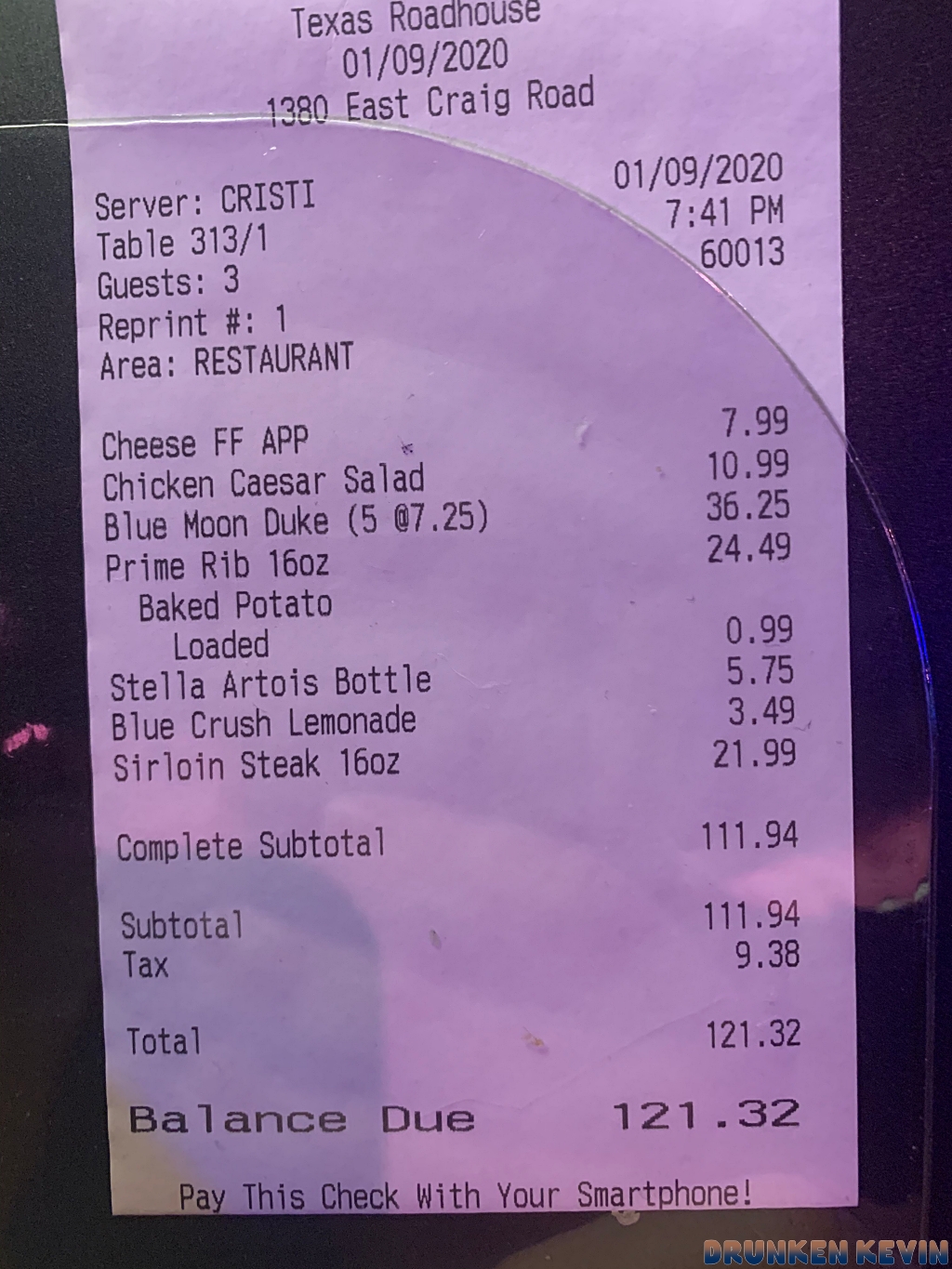 팁 제외하고, 121.32 달러!