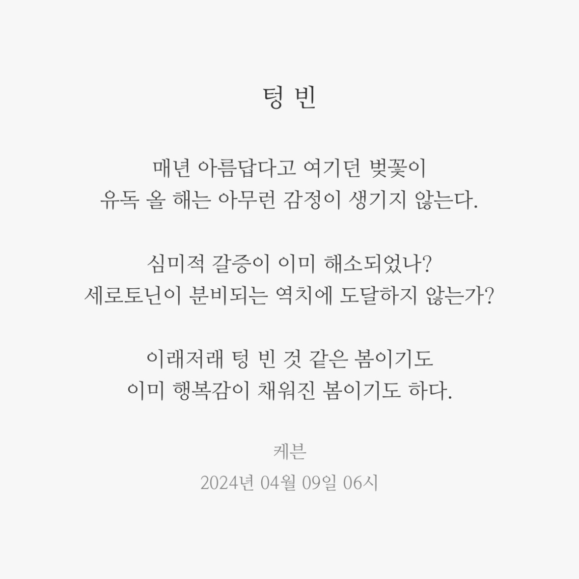 텅 빈 2024. 4. 9. 06:04 케븐 씀 반응형 반응형 공유하기 게시글 관리 DRUNKEN KEVIN '씀' 카테고리의 다른 글 아침마다 (0) 2025.12.09 의욕 (0) 2025.05.12 행복한 기억 (0) 2024.02.01 한참을 (2) 2023.06.06 과정 (0) 2023.05.29